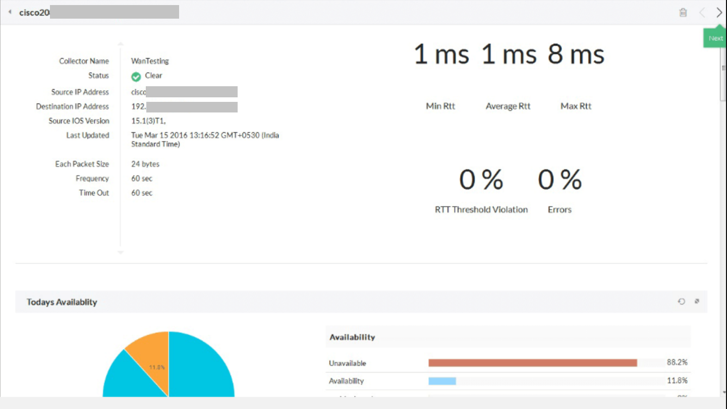 OpManager unterstützt das Monitoring drahtloser Netzwerke durch die Nutzung von Cisco IPSLA, um WAN-Verbindungen zu visualisieren und WAN-Ausfälle sowie Leistungsprobleme leichter zu beheben. Der WAN-RTT-Monitor (Round Trip Time) von OpManager liefert Details zur Latenz der WAN-Verbindungen, zur Bandbreitenauslastung, zur Round Trip Time und zur Hop-by-Hop-Leistung, um die WAN-Leistung zu optimieren.